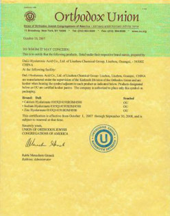 優(yōu)良的產(chǎn)品質(zhì)量來源于完善的質(zhì)量保證體系。 本公司的原料采購、原料的輸入、中間過程、最終產(chǎn)品、 檢驗和試驗及產(chǎn)品銷售等都被納入ISO9001-2008質(zhì)保體系中,嚴(yán)格控制各個環(huán)節(jié)質(zhì)量, 確保向客戶提供穩(wěn)定質(zhì)量的產(chǎn)品。本公司所有生產(chǎn)原料均采用非動物來源,產(chǎn)品獲得Kosher認(rèn)證。